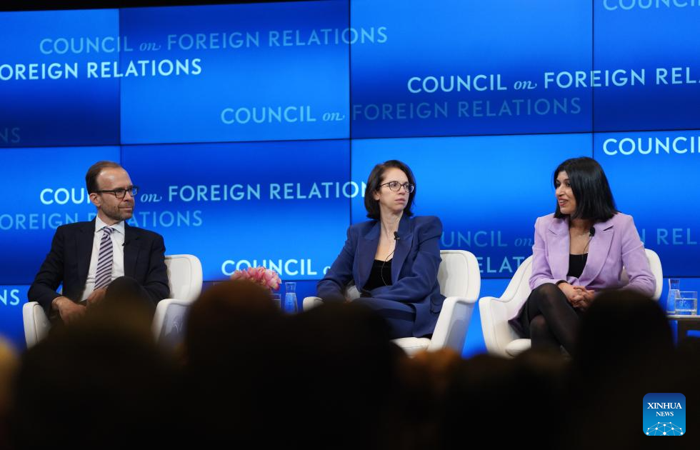 Jan Hatzius (L), chief economist at Goldman Sachs, Karen Karniol-Tambour (C), co-chief investment officer at Bridgewater Associates, and Natasha Sarin, a professor of law at Yale University, speak at a panel on the global economy at the Council on Foreign Relations in New York, the United States, Jan. 7, 2026. U.S. debt levels are likely to keep rising as political divisions and growing entitlement costs make it difficult to slow deficits, experts said on Wednesday. Speaking at a panel on the global economy at the Council on Foreign Relations, panelists said that the United States faces long-term fiscal pressure despite solid near-term economic performance. (Xinhua/Zhang Fengguo)