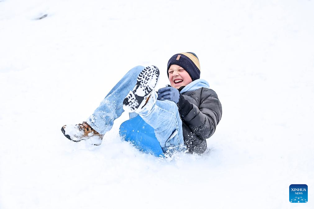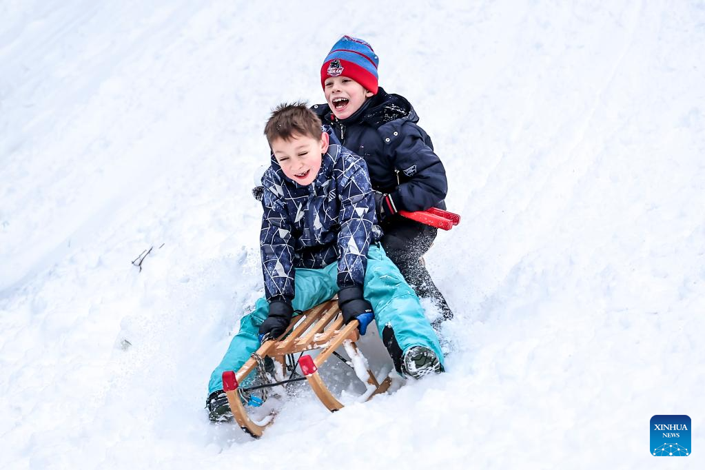 Children play in the snow in Budapest, Hungary on Jan. 7, 2026. (Photo by David Balogh/Xinhua)