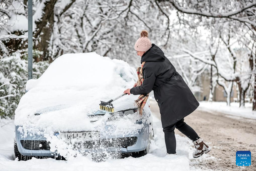 A woman clears the snow on a car in Budapest, Hungary on Jan. 7, 2026. (Photo by David Balogh/Xinhua)