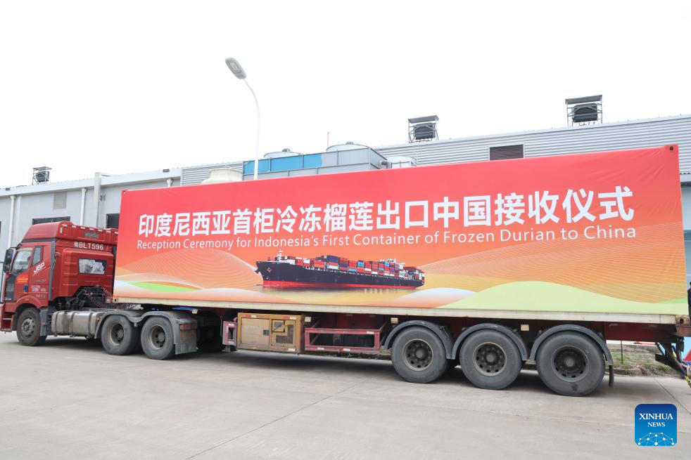 NANNING, Jan. 8 (Xinhua) -- A ceremony was held on Tuesday at Qinzhou Port, south China's Guangxi Zhuang Autonomous Region, marking the arrival of Indonesia's first container of frozen durian exported to China via maritime transport, an important step in expanding bilateral agricultural trade.