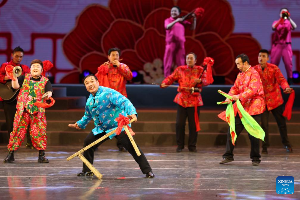 Actors from an art troupe of Gansu's Wenxian County perform during the first show of a mass cultural performance and broadcasting event held at the Lanzhou Concert Hall in Lanzhou, northwest China's Gansu Province, on Jan. 7, 2026. The mass cultural performance and broadcasting event, which plans to organize 240 mass cultural shows throughout the year, aims to build cultural and artistic stages for the general public at their doorsteps. (Xinhua/Chen Bin)