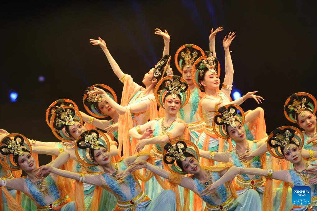 Actresses from the cultural center of Gansu's Jiuquan City perform Dunhuang dance during the first show of a mass cultural performance and broadcasting event held at the Lanzhou Concert Hall in Lanzhou, northwest China's Gansu Province, on Jan. 7, 2026. The mass cultural performance and broadcasting event, which plans to organize 240 mass cultural shows throughout the year, aims to build cultural and artistic stages for the general public at their doorsteps. (Xinhua/Chen Bin)