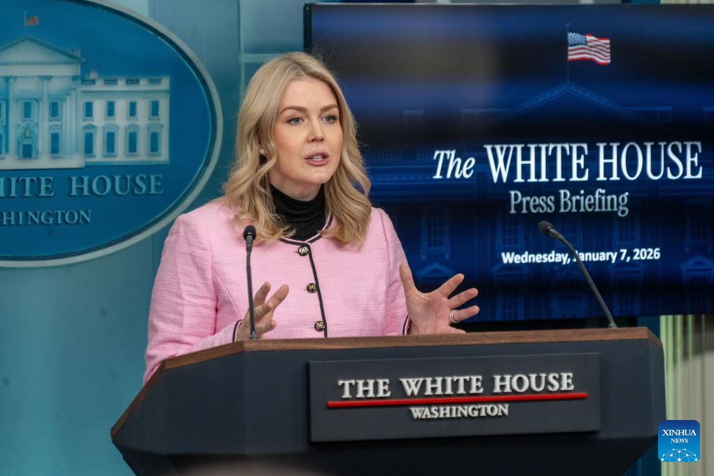 White House Press Secretary Karoline Leavitt attends a daily press briefing at the White House in Washington, D.C., the United States, on Jan. 7, 2026. White House Press Secretary Karoline Leavitt said Wednesday that the Trump administration will continue to enforce an embargo against all "shadow fleet" vessels alleged by the U.S. to illegally transport oil. Leavitt made the remarks hours after the U.S. Coast Guard seized two Venezuela-linked oil tankers in the Atlantic and the Caribbean on Wednesday morning. (Photo by Li Yuanqing/Xinhua)