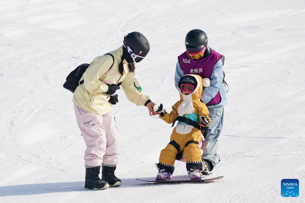 A child practices snowboarding with the help of a coach (R) at the Guangwu international ski resort in Shanyin County of Shuozhou, north China's Shanxi Province, Jan. 7, 2026. Shanyin County has been leveraging its geographical advantage to develop ice and snow-themed tourism, which is now a new driver for the local economy. (Xinhua/Yang Chenguang)