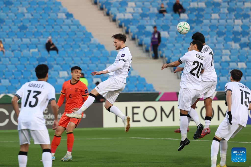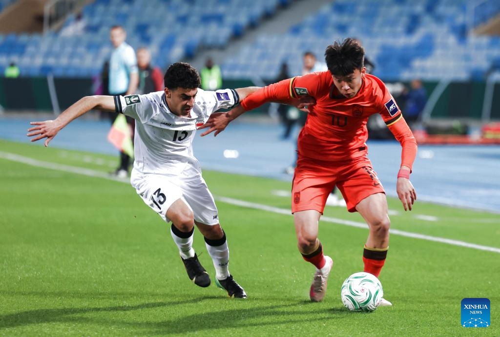 Li Zhenquan (C) of China competes during the 2026 AFC U23 Asian Cup group match between China and Iraq in Riyadh, Saudi Arabia, Jan. 8, 2026. (Xinhua/Wang Haizhou)