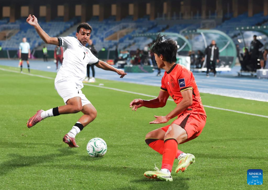 Mohammed Jameel Al-Hasani (L) of Iraq competes during the 2026 AFC U23 Asian Cup group match between China and Iraq in Riyadh, Saudi Arabia, Jan. 8, 2026. (Xinhua/Wang Haizhou)