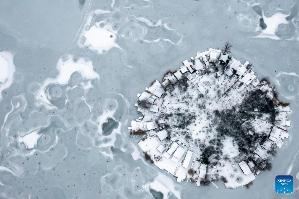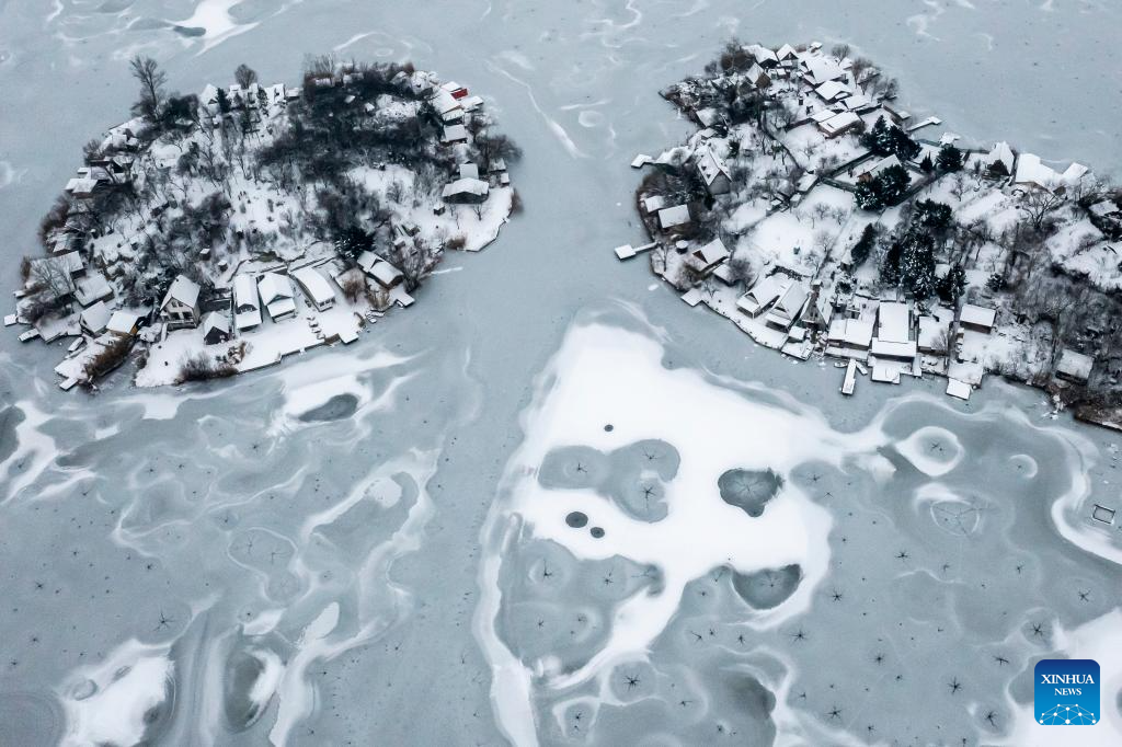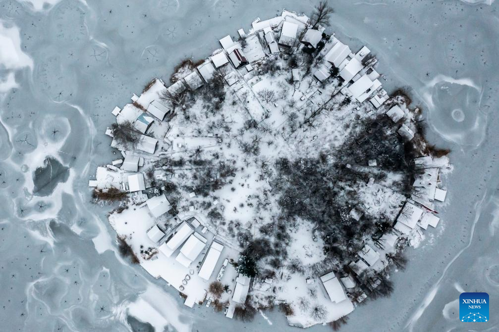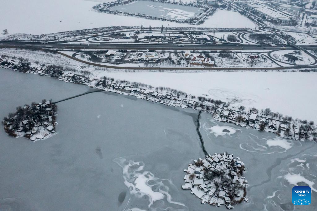 An aerial drone photo shows the frozen Kavicsos Lake in Budapest, Hungary, Jan. 9, 2026. (Photo by David Balogh/Xinhua)