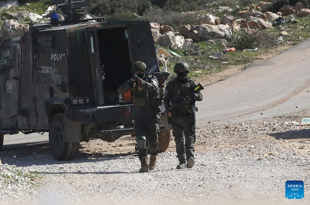 Members of Israeli forces stand guard during a house demolition operation in the Upper Ta'awun area of Nablus in the West Bank on Jan. 8, 2026. (Photo by Nidal Eshtayeh/Xinhua)