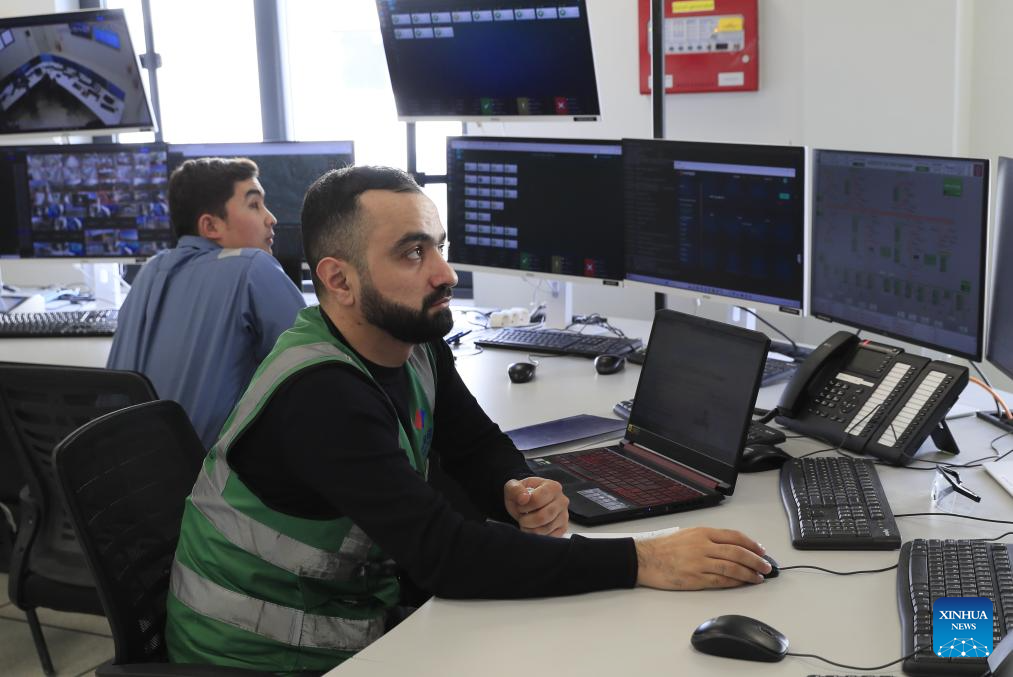 Technicians work at a control center of the Khizi-Absheron Wind Power Plant in Azerbaijan, Jan. 8, 2026. Azerbaijani President Ilham Aliyev on Thursday inaugurated the 240-megawatt Khizi-Absheron Wind Power Plant, a flagship renewable energy project constructed by PowerChina Huadong Engineering Corporation Limited (HDEC). (Xinhua/Chen Junfeng)