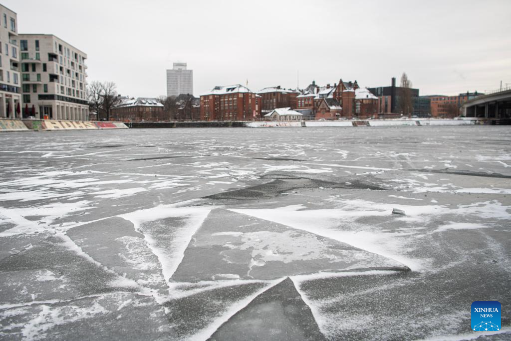 A frozen river is pictured in Berlin, capital of Germany, Jan. 9, 2026. Winter Storm Elli swept across large parts of Germany on Friday, killing at least three people and severely disrupting transport, schools and public services, particularly in the country's north. (Xinhua/Zhang Haofu)