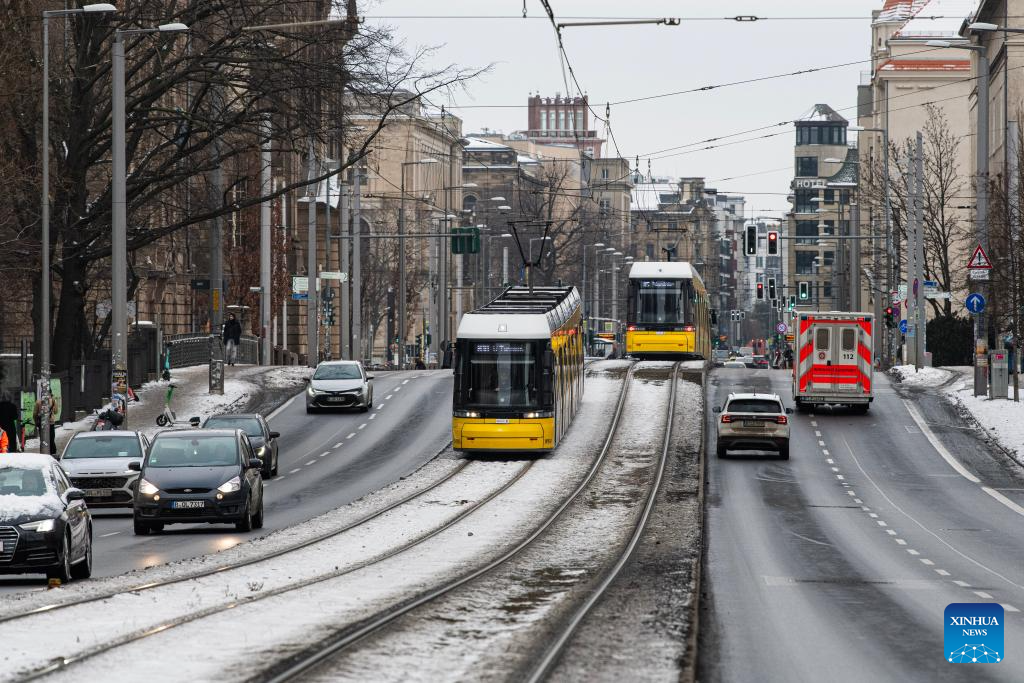 Trams and other vehicles run on a street in Berlin, capital of Germany, Jan. 9, 2026. Winter Storm Elli swept across large parts of Germany on Friday, killing at least three people and severely disrupting transport, schools and public services, particularly in the country's north. (Xinhua/Zhang Haofu)