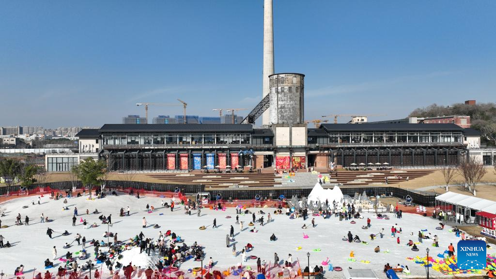 A drone photo taken on Jan. 9, 2026 shows people enjoying themselves at an ice and snow carnival in Hangzhou, east China's Zhejiang Province. An ice and snow carnival kicked off at the Hangzhou grand canal steelworks park on Friday, attracting visitors across the city.
