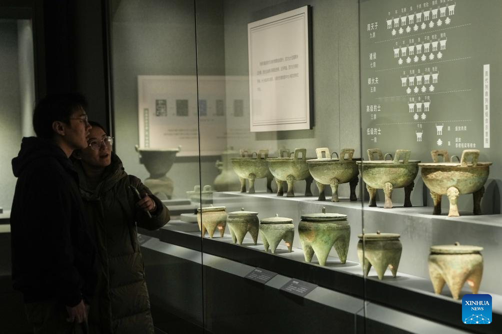 People visit an exhibition featuring culture of ancient Dongyi tribes at the Shandong Museum in Jinan, east China's Shandong Province, Jan. 9, 2026. The exhibition showcased over 110 pieces (sets) of cultural relics highlighting the culture of ancient Dongyi tribes. (Xinhua/Zhu Zheng)