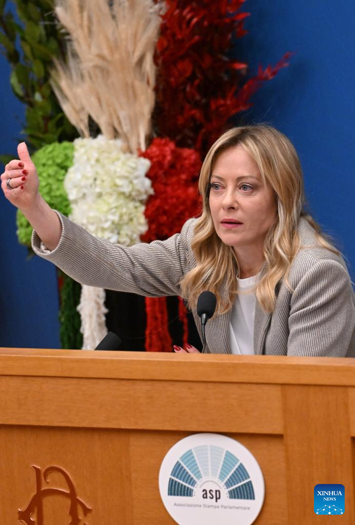 Italian Prime Minister Giorgia Meloni speaks at a press conference in Rome, Italy, Jan. 9, 2026. (Photo by Alberto Lingria/Xinhua)