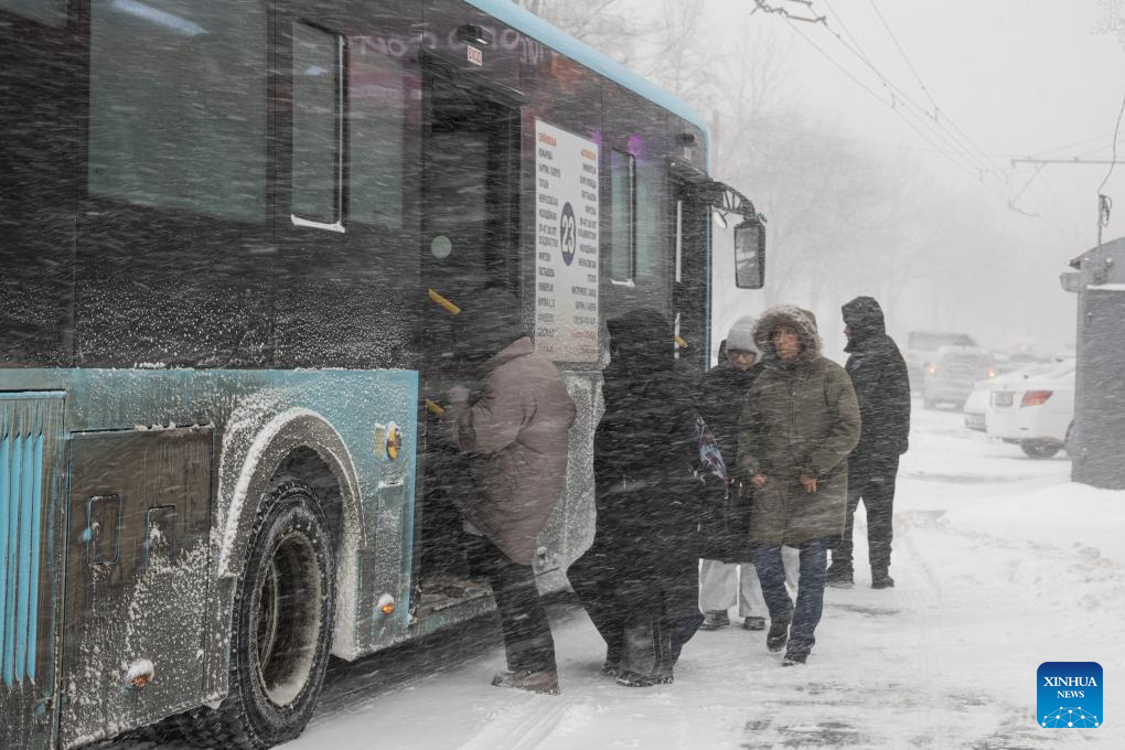 People get on a bus in a blizzard in Vladivostok, Russia, Jan. 10, 2026. (Photo by Andrey Matveenko/Xinhua)