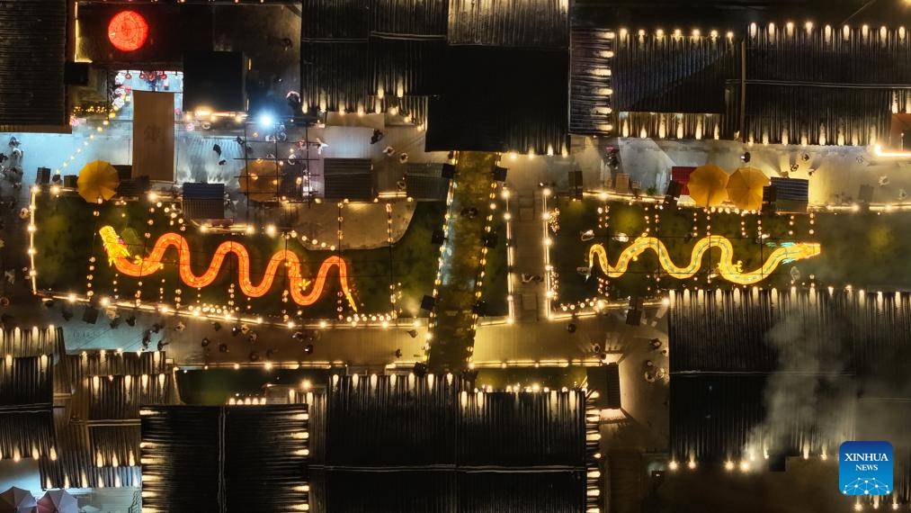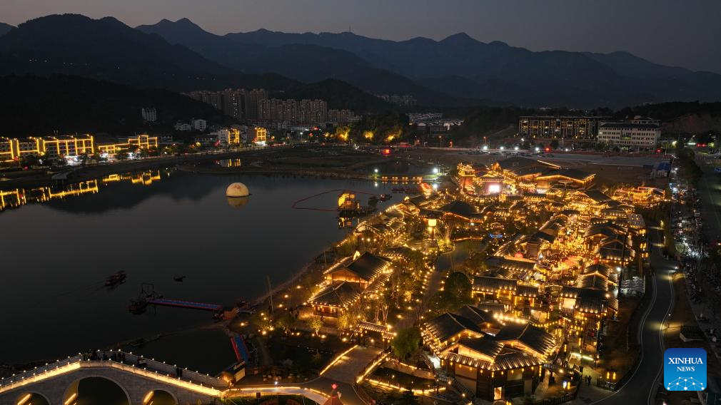 An aerial drone photo taken on Jan. 9, 2026 shows the night view of Nanyueli, a food and cultural block in Nanyue District of Hengyang, central China's Hunan Province. Integrating various business formats such as catering, accommodation, travel photography and performances, Nanyueli provides tourists with diverse traveling experiences. In recent years, the local government has been creating new scenarios and business forms to boost the night economy by leveraging the historical and cultural resources. (Xinhua/Chen Zhenhai)