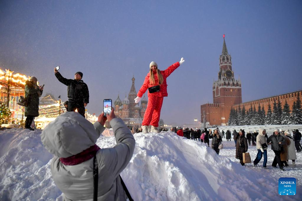 People take pictures at snow-covered Red Square in Moscow, Russia, Jan. 9, 2026. (Photo by Alexander Zemlianichenko Jr/Xinhua)