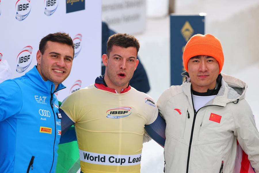 ST. MORITZ, Switzerland, Jan. 10 (Xinhua) -- China's Zhao Dan and Yin Zheng claimed the gold medal in the skeleton mixed team event at the St. Moritz leg of the 2025-2026 IBSF Skeleton World Cup on Friday, securing China's first skeleton World Cup title of the season.