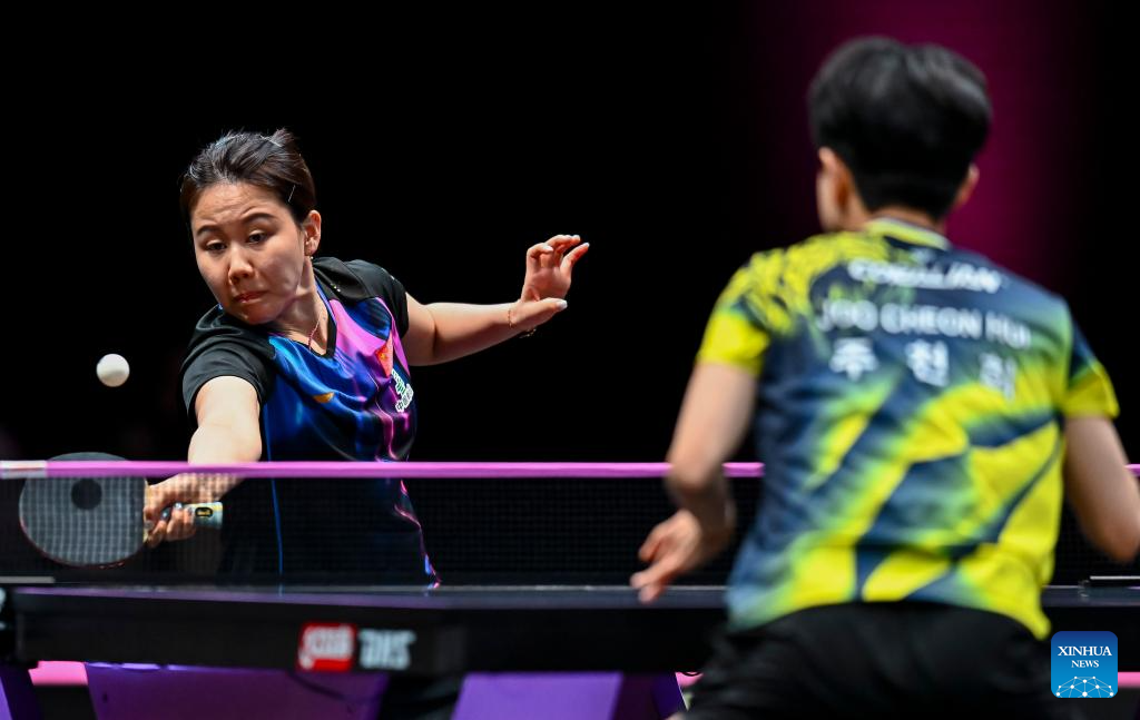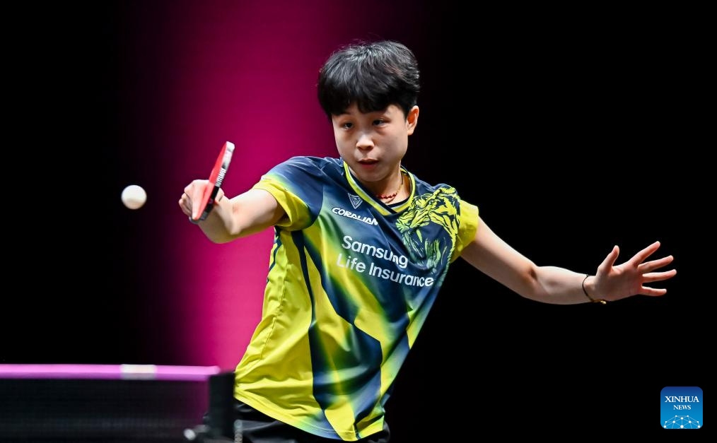 Joo Cheonhui of South Korea hits a return during the women's singles Round of 16 match against Chen Xingtong of China at the WTT Champions Doha 2026 in Doha, Qatar, on Jan. 9, 2026. (Photo by Nikku/Xinhua)