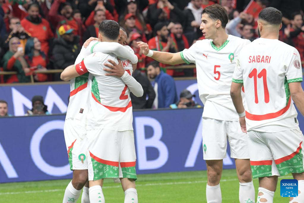 Morocco's players celebrate during the Africa Cup of Nations quarterfinal match between Morocco and Cameroon in Rabat, Morocco, Jan. 9, 2026. (Photo by Aissa/Xinhua)