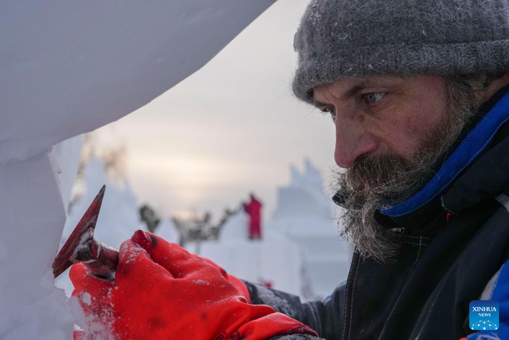 A Russian contestant creates his snow sculpture at the venue of Sun Island Snow Expo in Harbin, northeast China's Heilongjiang Province, Jan. 9, 2026. A four-day snow sculpture competition concluded here on Friday, with the participation of 25 teams from 13 countries. (Xinhua/Wang Song)