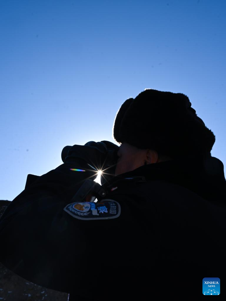 Police officer Guo Jianye observes with a telescope in the Laohugou region of Menyuan Hui Autonomous County in Haibei Tibetan Autonomous Prefecture, northwest China's Qinghai Province, Jan. 9, 2026. For years, police officers and rangers inside Qilian Mountain National Park in northwest China's Qinghai Province have dedicated themselves to their work, carrying out regular patrols and safeguarding the region's ecological security despite high altitude and harsh winter weather. (Xinhua/Zhang Long)