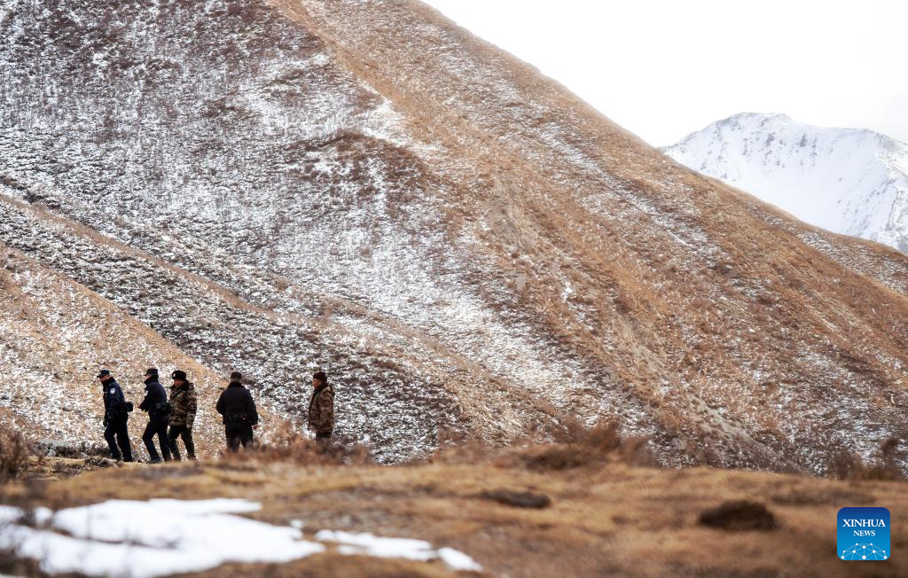 Police officers and rangers patrol the Qilian Mountains in the Laohugou region of Menyuan Hui Autonomous County in Haibei Tibetan Autonomous Prefecture, northwest China's Qinghai Province, Jan. 8, 2026. For years, police officers and rangers inside Qilian Mountain National Park in northwest China's Qinghai Province have dedicated themselves to their work, carrying out regular patrols and safeguarding the region's ecological security despite high altitude and harsh winter weather. (Xinhua/Zhang Long)