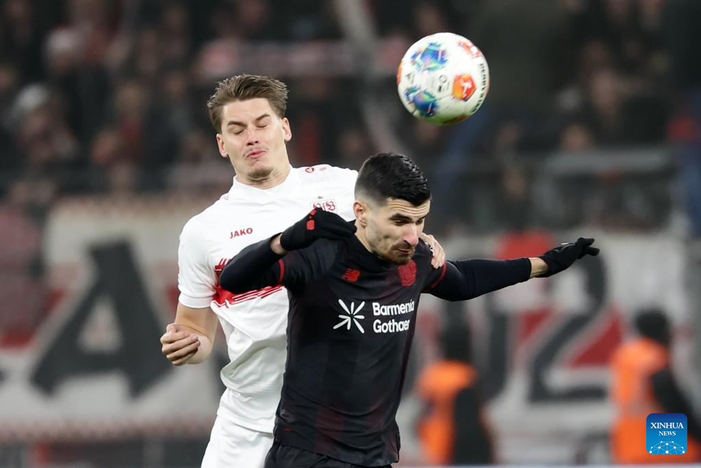 Martin Terrier (R) of Bayer 04 Leverkusen and Ramon Hendriks of VfB Stuttgart head for the ball during the German first division of Bundesliga football match between Bayer 04 Leverkusen and VfB Stuttgart in Leverkusen, Germany, Jan. 10, 2026. (Photo by Joachim Bywaletz/Xinhua)