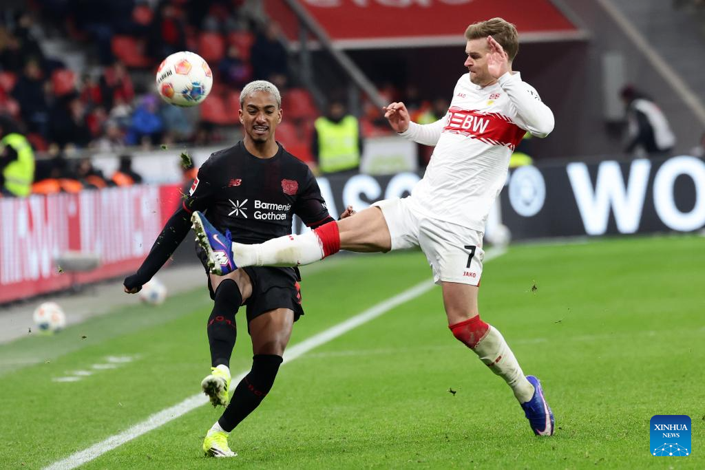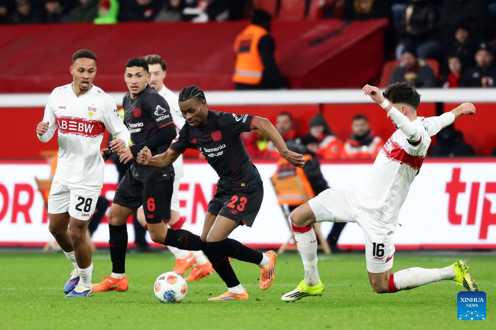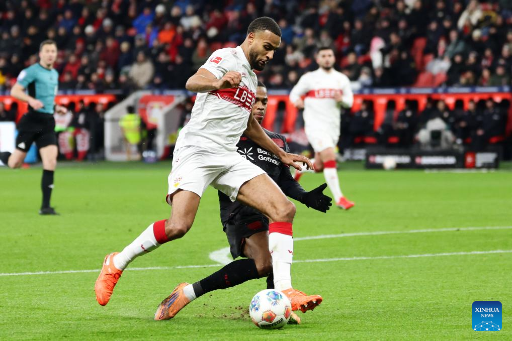 Nathan Tella (2nd R) of Bayer 04 Leverkusen vies with Atakan Karazor (1st R) of VfB Stuttgart during the German first division of Bundesliga football match between Bayer 04 Leverkusen and VfB Stuttgart in Leverkusen, Germany, Jan. 10, 2026. (Photo by Joachim Bywaletz/Xinhua)