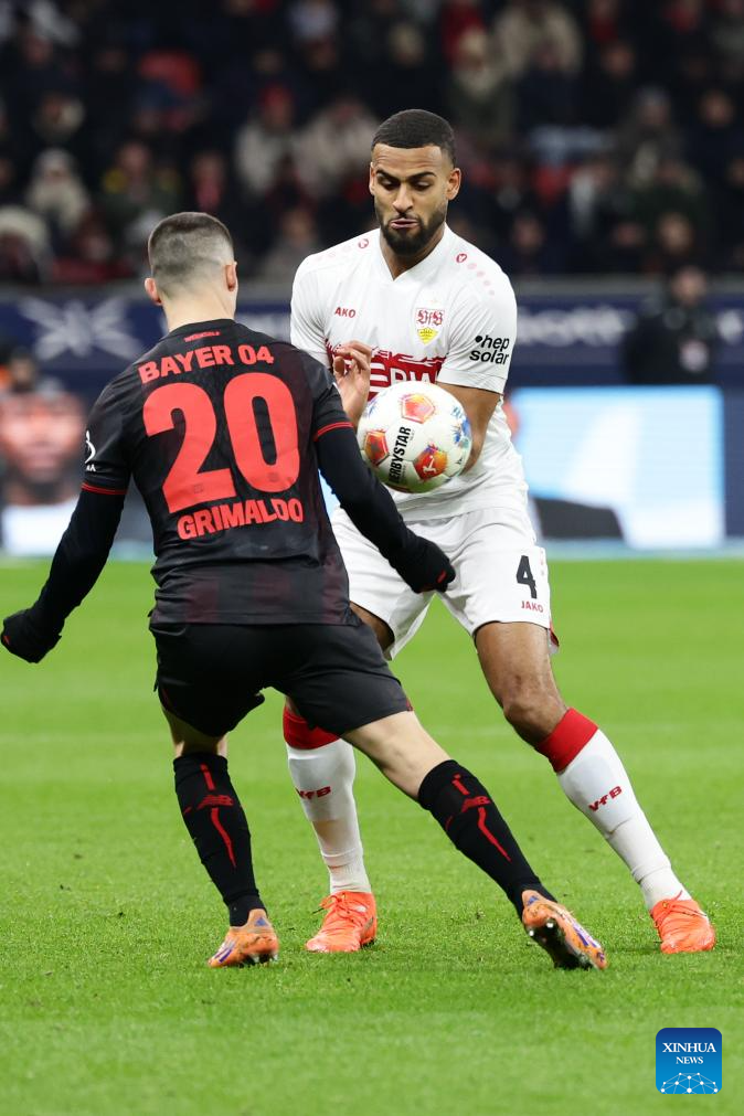 Jeanuel Belocian (rear) of Bayer 04 Leverkusen vies with Josha Vagnoman of VfB Stuttgart during the German first division of Bundesliga football match between Bayer 04 Leverkusen and VfB Stuttgart in Leverkusen, Germany, Jan. 10, 2026. (Photo by Joachim Bywaletz/Xinhua)