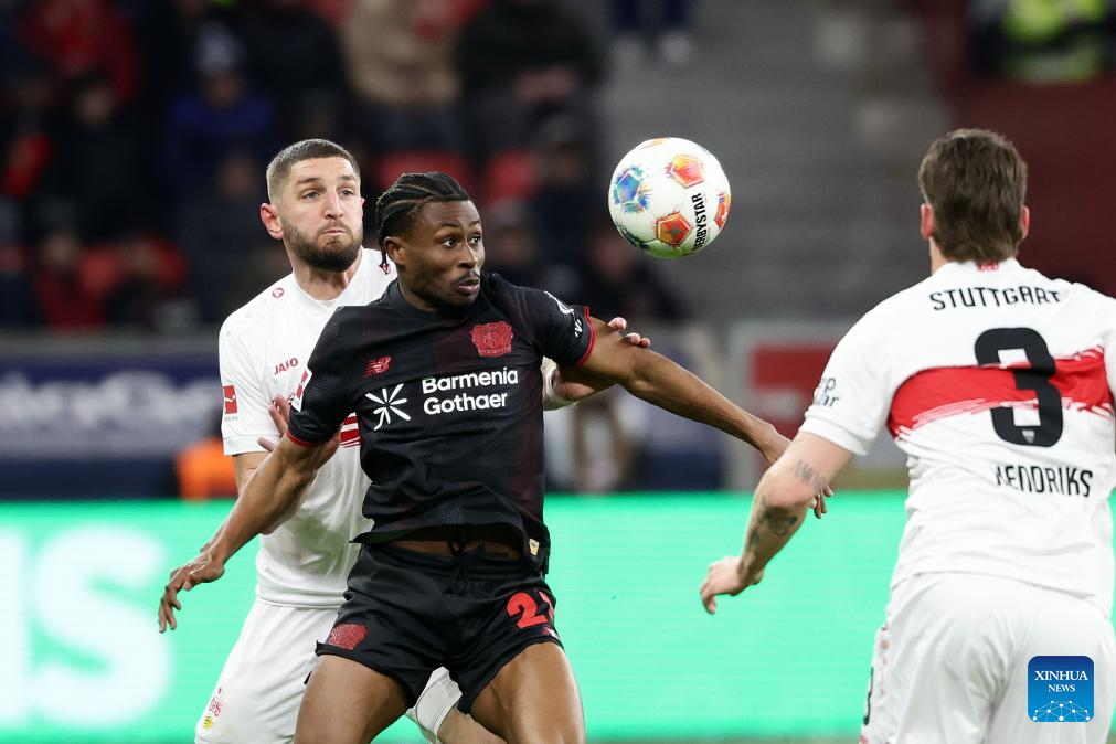 Nathan Tella (C) of Bayer 04 Leverkusen vies with Josha Vagnoman (L) of VfB Stuttgart during the German first division of Bundesliga football match between Bayer 04 Leverkusen and VfB Stuttgart in Leverkusen, Germany, Jan. 10, 2026. (Photo by Joachim Bywaletz/Xinhua)