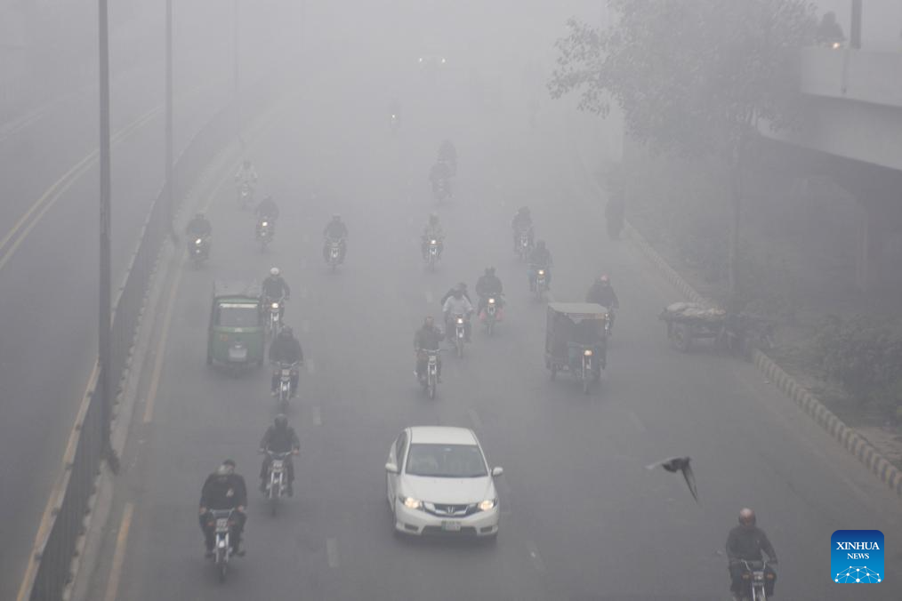 Vehicles move amid dense fog on a road in Lahore, Pakistan, Jan. 11, 2026. (Photo by Sajjad/Xinhua)