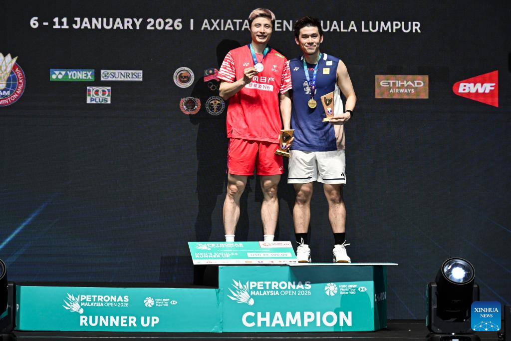 Kunlavut Vitidsarn of Thailand and Shi Yuqi (L) of China pose during the awarding ceremony after the men's singles final match at the Malaysia Open 2026 badminton tournament in Kuala Lumpur, Malaysia, Jan. 11, 2026. (Xinhua/Cheng Yiheng)