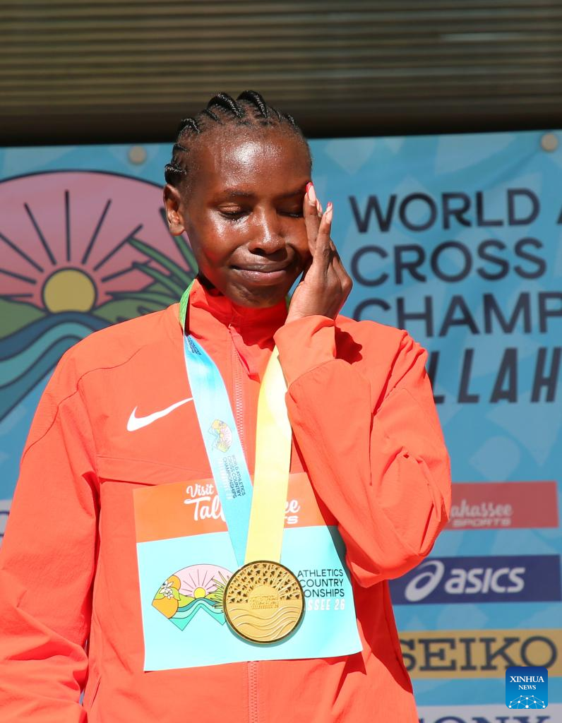 Gold medalist Kenya's Agnes Jebet Ngetich reacts during the awarding ceremony for the Senior Women's Race at the World Athletics Cross Country Championships 2026 in Tallahassee, Florida, the United States, on Jan. 10, 2026. (Xinhua/Zhang Fengguo)
