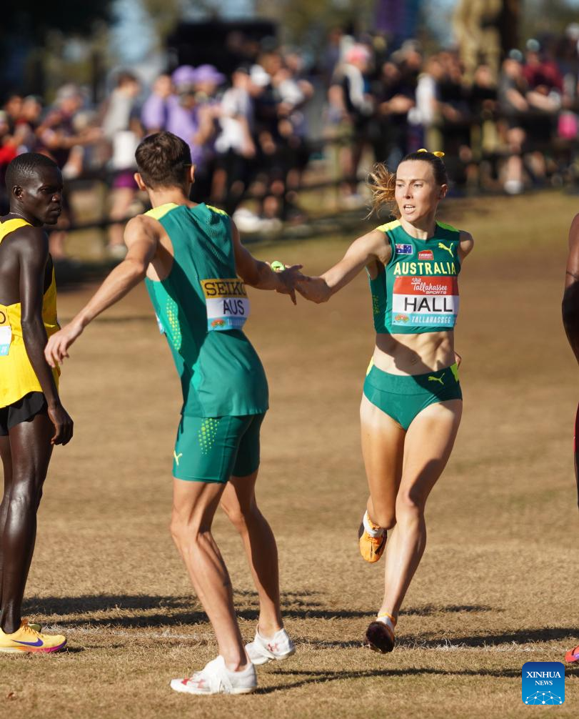 Australia's Linden Hall (R) and Jack Anstey relay during the Mixed Relay competition at the World Athletics Cross Country Championships 2026 in Tallahassee, Florida, the United States, on Jan 10, 2026. (Xinhua/Zhang Fengguo)
