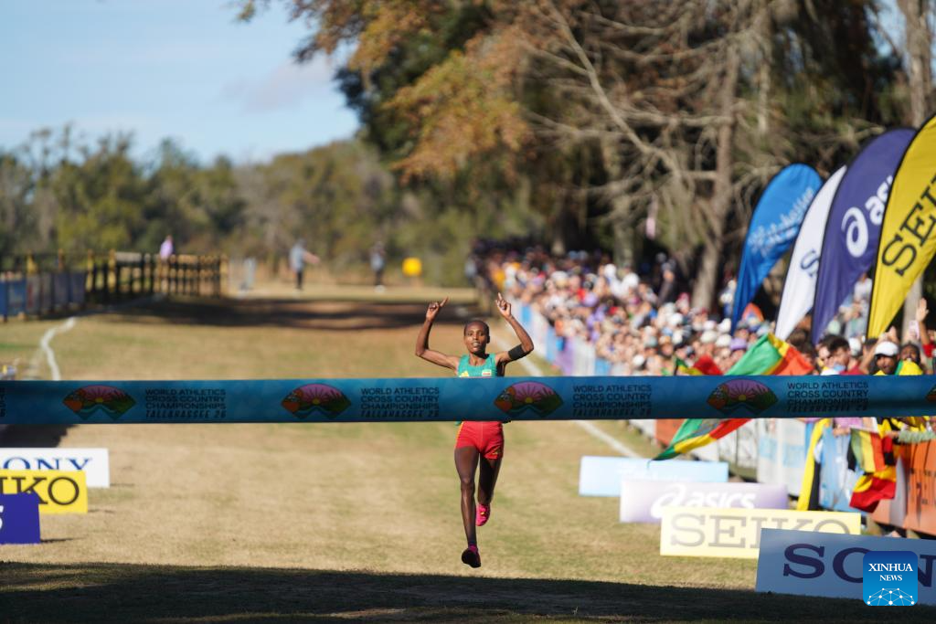 Ethiopia's Marta Alemayo crosses the finish line to win the U20 women's race at the World Athletics Cross Country Championships 2026 in Tallahassee, Florida, the United States, on Jan. 10, 2026. (Xinhua/Zhang Fengguo)