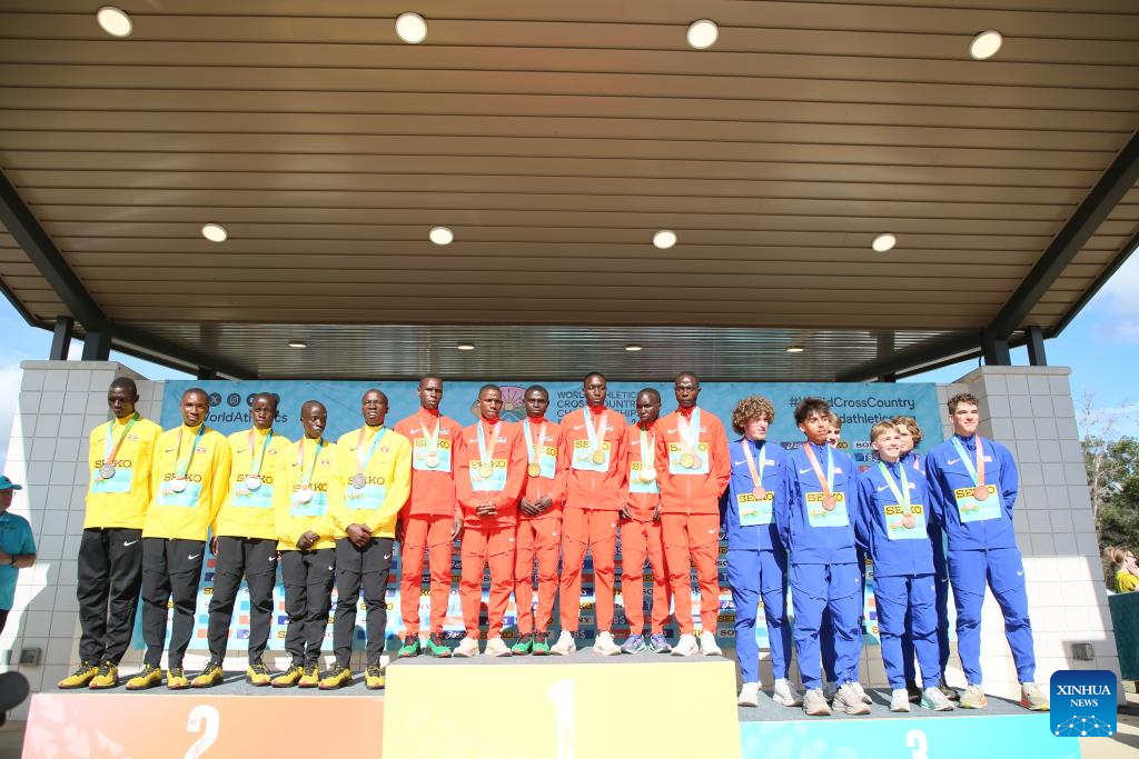 Gold medalists team Kenya (C), silver medalists team Uganda (L) and bronze medalists team United States of America attend the medal ceremony for the Junior Men's team event at the World Athletics Cross Country Championships 2026 in Tallahassee, Florida, the United States, on Jan. 10, 2026. (Xinhua/Zhang Fengguo)