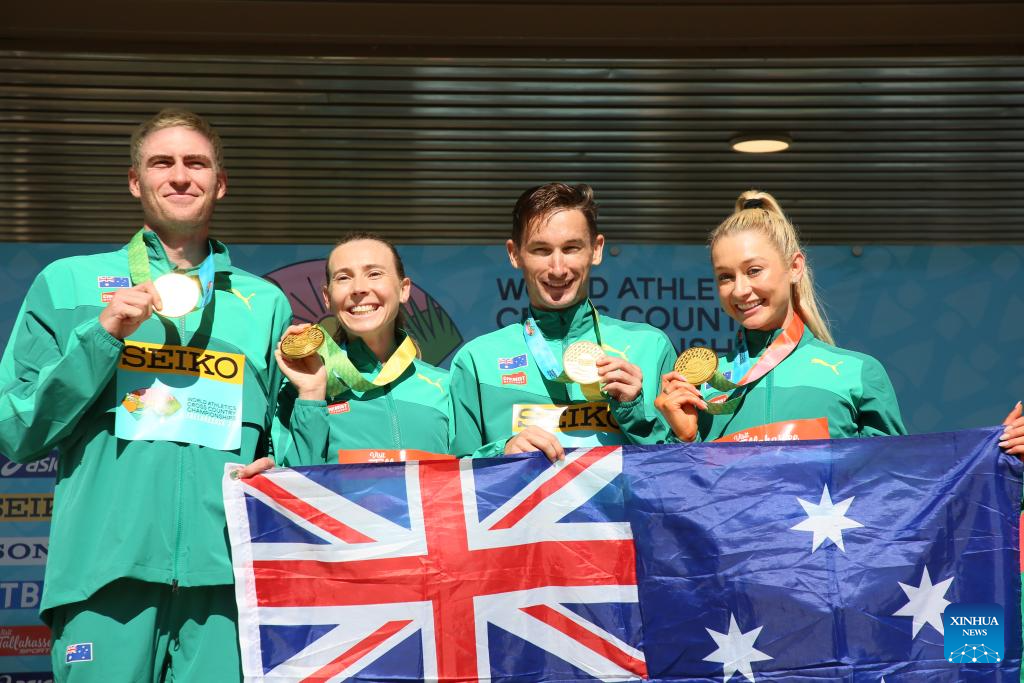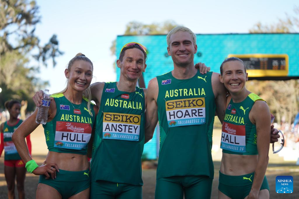 Team Australia celebrate after winning the Mixed Relay competition at the World Athletics Cross Country Championships 2026 in Tallahassee, Florida, the United States, on Jan 10, 2026. (Xinhua/Zhang Fengguo)