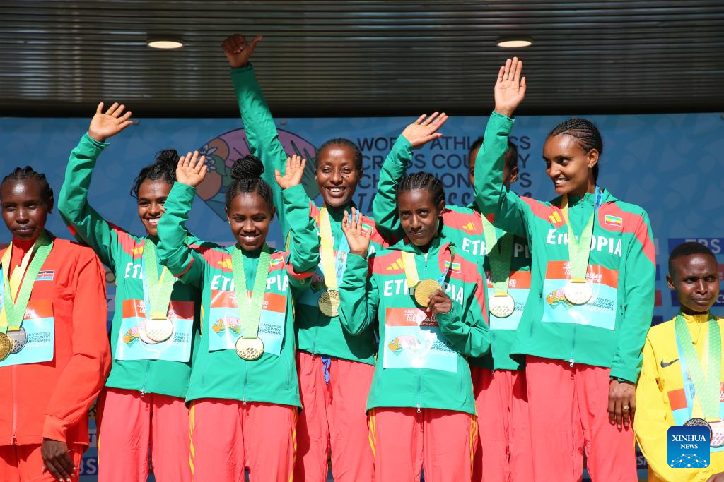 Gold medalists team Ethiopia celebrate during the medal ceremony for the Senior Women's team event at the World Athletics Cross Country Championships 2026 in Tallahassee, Florida, the United States, on Jan. 10, 2026. (Xinhua/Zhang Fengguo)