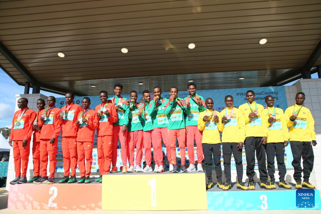 Gold medalists team Ethiopia (C), silver medalists team Kenya (L) and bronze medalists team Uganda attend the medal ceremony for the Senior Men's team event at the World Athletics Cross Country Championships 2026 in Tallahassee, Florida, the United States, on Jan. 10, 2026. (Xinhua/Zhang Fengguo)