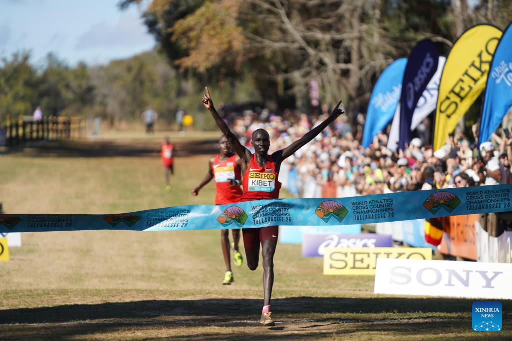 Kenya's Frankline Kibet crosses the finish line to win the U20 Men's Race at the World Athletics Cross Country Championships 2026 in Tallahassee, Florida, the United States, on Jan. 10, 2026. (Xinhua/Zhang Fengguo)