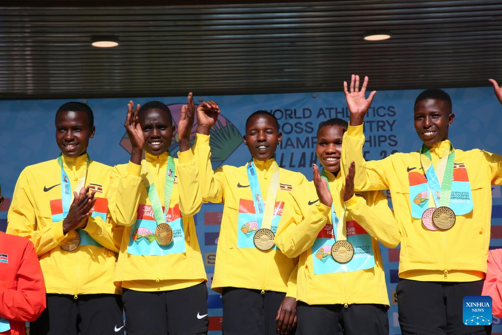 Gold medalists team Uganda celebrate during the medal ceremony for the Junior Women's team event at the World Athletics Cross Country Championships 2026 in Tallahassee, Florida, the United States, on Jan. 10, 2026. (Xinhua/Zhang Fengguo)