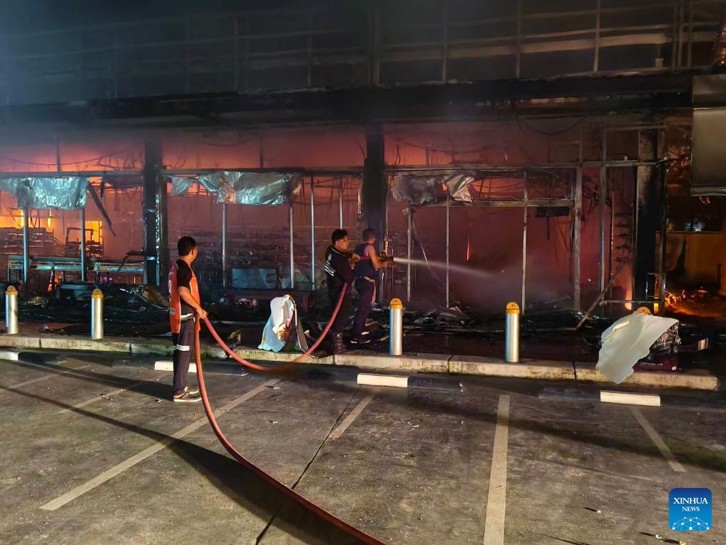 This photo released by the Royal Thai Armed Forces on Jan. 11, 2026 shows rescuers extinguishing a fire at a petrol station in Narathiwat, Thailand. Multiple petrol stations in Thailand's southern border provinces were hit by arson attacks and explosions late Saturday night, leaving one police officer injured, Thai military sources said on Sunday. (Royal Thai Armed Forces/Handout via Xinhua)
