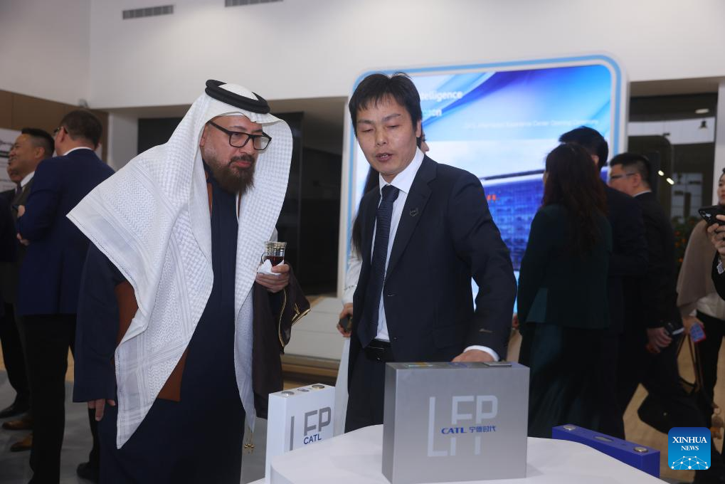 Bruce Li (R, front), president of aftermarket and battery management at Contemporary Amperex Technology Co. Ltd, introduces battery products to Anbasa Kandiel (L, front), chief advisor of the Saudi Ministry of Industry and Mineral Resources, at the Middle East's first NING SERVICE Experience Center in Riyadh, Saudi Arabia on Jan. 10, 2026. Chinese battery giant Contemporary Amperex Technology Co. Ltd (CATL) on Saturday opened the Middle East's first NING SERVICE Experience Center in Riyadh, marking its largest new energy aftermarket facility outside China. (CATL/Handout via Xinhua)