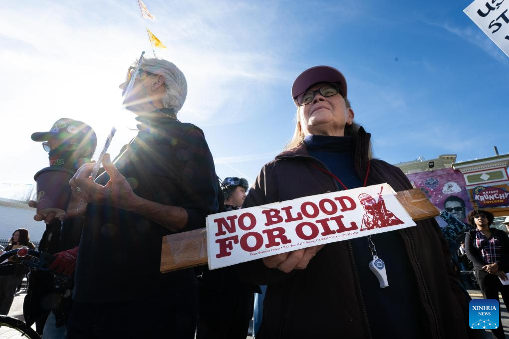 People attend a protest in San Francisco, California, the United States, on Jan. 10, 2026. People gathered here to protest against the U.S. attack on Venezuela, as well as a fatal shooting of a 37-year-old woman by an Immigration and Customs Enforcement agent in Minnesota on Jan. 7. (Photo by Ziyu Julian Zhu/Xinhua)