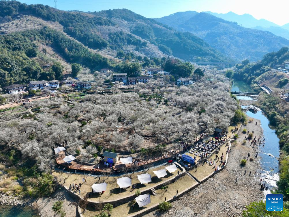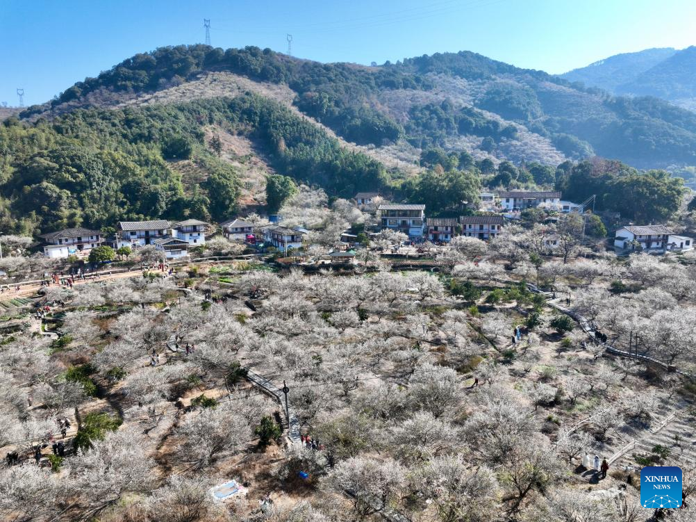 An aerial drone photo taken on Jan. 10, 2026 shows tourists enjoying plum blossoms in Yongtai County, southeast China's Fujian Province. The annual plum blossom festival kicked off here on Saturday and is expected to promote local tourism and present the natural beauty of the county through various cultural activities. (Xinhua/Jiang Kehong)