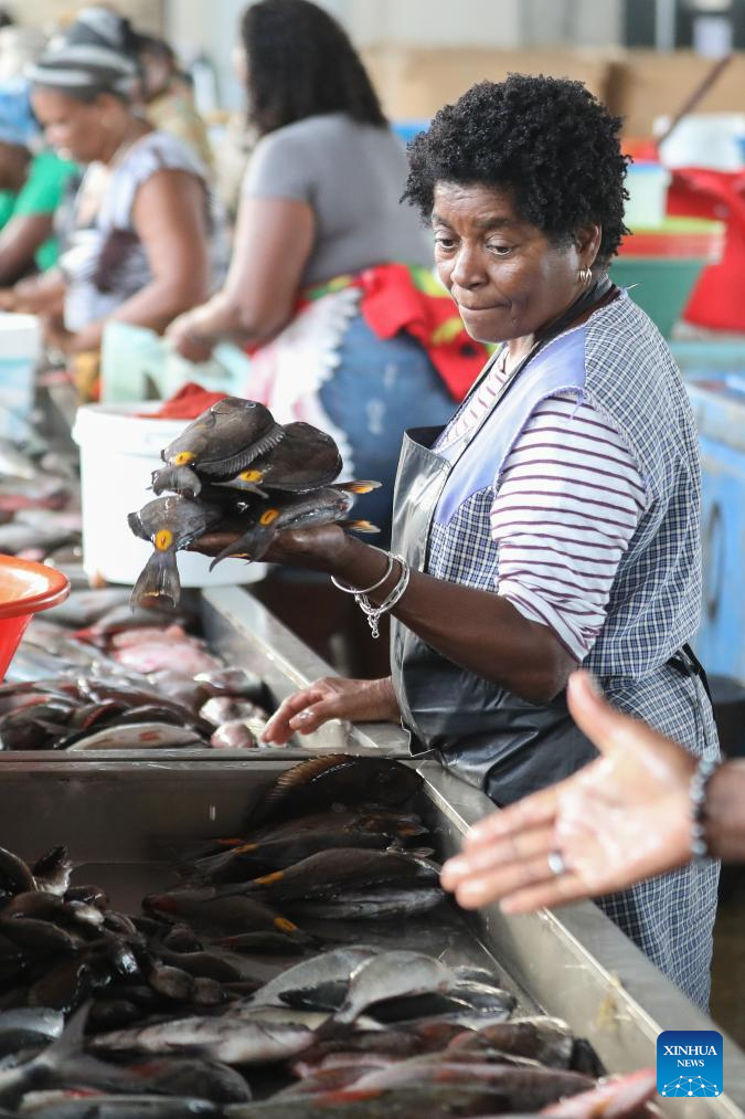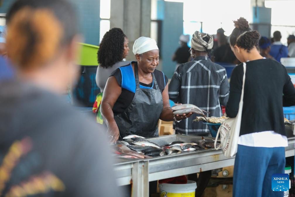 Vendors work at the Praia Fishing Complex in Praia, capital of Cape Verde, on Jan. 10, 2026. Cape Verde is an island country located in the Atlantic Ocean off the west coast of Africa, endowed with abundant marine resources. Fisheries play a vital role in the national economy and livelihoods, serving as a key source of employment, food supply and income. (Photo by Elton Monteiro/Xinhua)