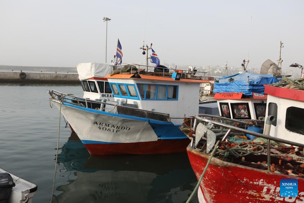 Small fishing boats are seen moored at the Praia Port in Praia, capital of Cape Verde, on Jan. 10, 2026. Cape Verde is an island country located in the Atlantic Ocean off the west coast of Africa, endowed with abundant marine resources. Fisheries play a vital role in the national economy and livelihoods, serving as a key source of employment, food supply and income. (Photo by Elton Monteiro/Xinhua)