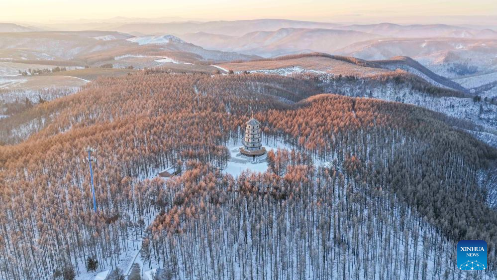 An aerial drone photo taken on Jan. 10, 2026 shows the winter scenery at the Saihanba national nature reserve in Chengde City, north China's Hebei Province. (Photo by Liu Mancang/Xinhua)
