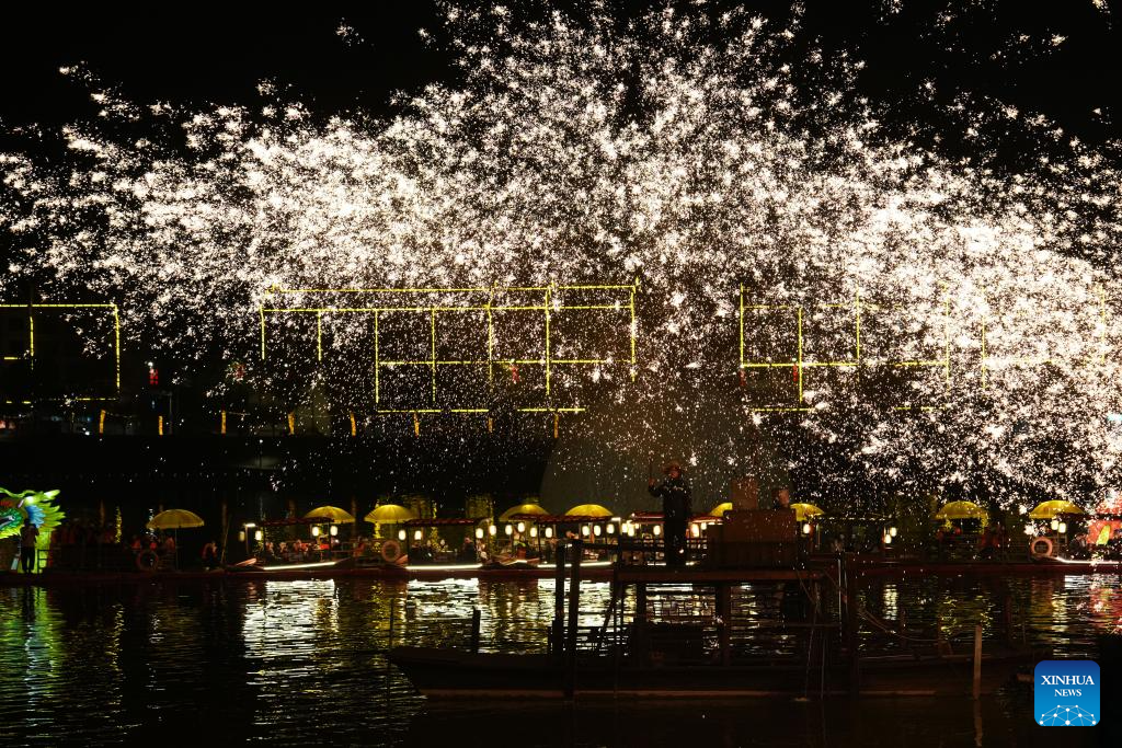 A molten iron firework show is staged at Nanyueli, a food and cultural block in Nanyue District of Hengyang, central China's Hunan Province, on Jan. 9, 2026. (Xinhua/Chen Zhenhai)